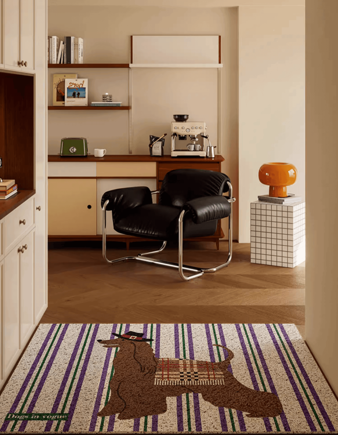 Welcome guests with retro charm and playful energy! Our Paw-sitive Woof Door Mat features Afghan Hounds and Dachshunds dressed in preppy outfits set against vibrant stripes, bringing a delightful touch of character to your entrance.