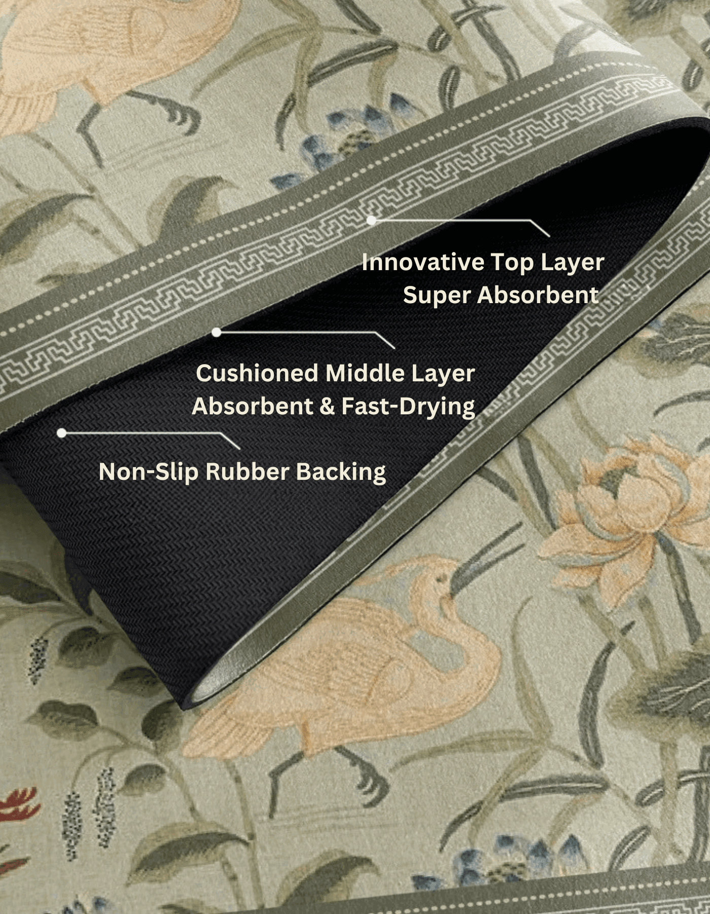 Step out of your bath onto the luxurious Pondside Serenity Bath Mat. This exquisite mat features hand-painted details of water lilies and graceful wild water birds, capturing the tranquil essence of a calm pond. Designed to keep your feet clean and dry, itβs crafted with fast-drying, absorbent Napa leather and an anti-slip backing for safety and comfort. Elevate your daily routine with Maison Matta's Pondside Serenity Bath Mat, and transform your bathroom into a peaceful retreat.