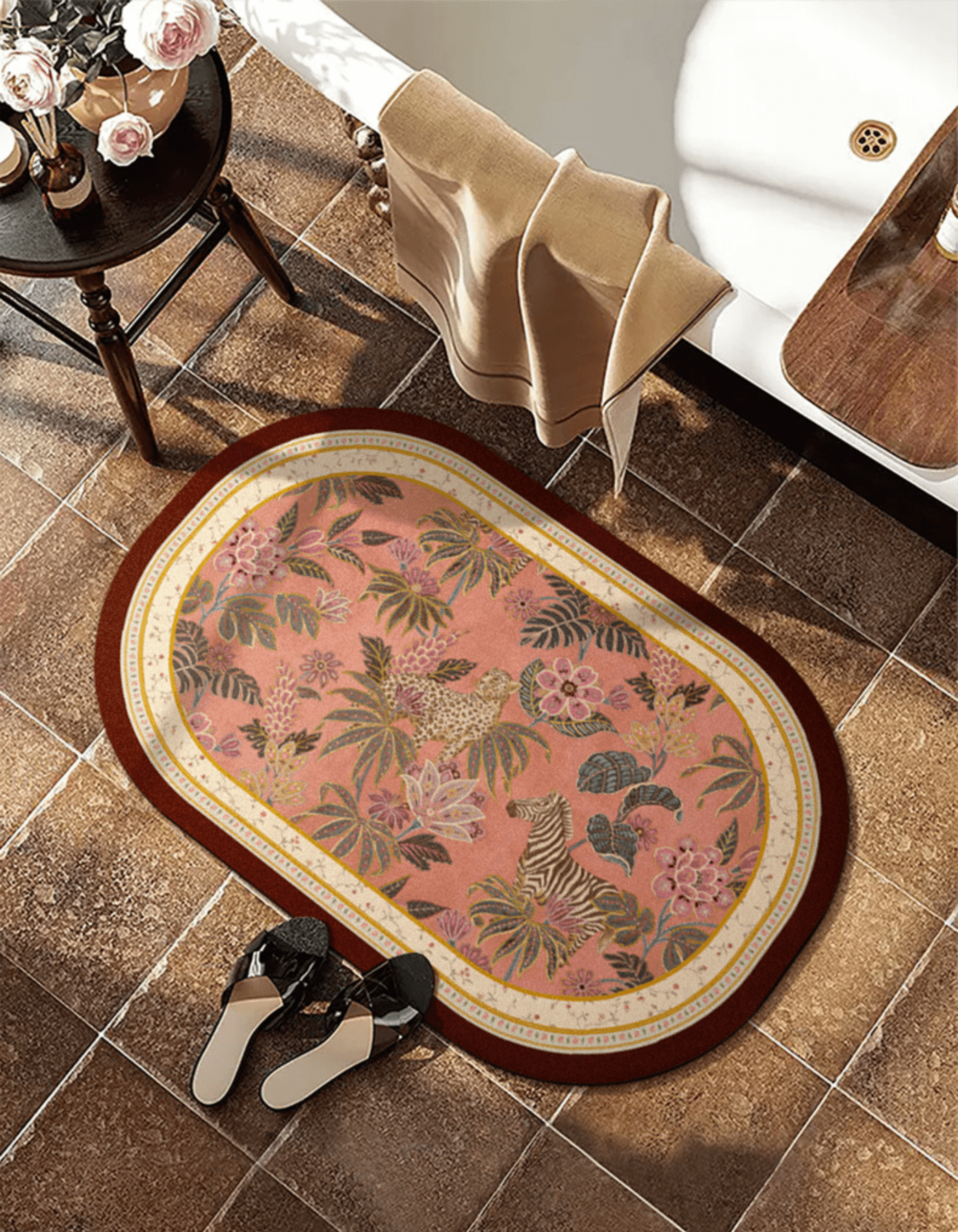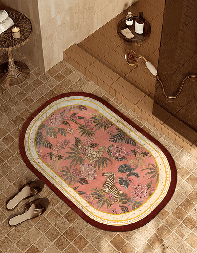 Leave your feet clean and dry after every bath with our antibacterial, eco-friendly and quick drying, Napa leather Safari Blossom Bath Mat. The bold animal print and rich rustic colors transform your bathroom into a cozy and welcoming space. Elevate your daily routine with Maison Matta's Safari Blossom Bath Mat, a perfect blend of elegance and functionality that redefines your bathroom experience.