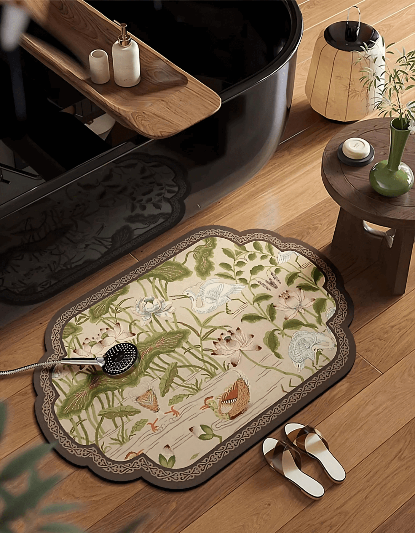 Step out of your bath onto the luxurious Tranquil Waters Bath Mat. This exquisite mat features hand-painted details of water lilies and graceful wild water birds, capturing the tranquil essence of a calm pond. Designed to keep your feet clean and dry, itβs crafted with fast-drying, absorbent Napa leather and an anti-slip backing for safety and comfort. Elevate your daily routine with Maison Matta's Tranquil Waters Bath Mat, and transform your bathroom into a peaceful retreat.