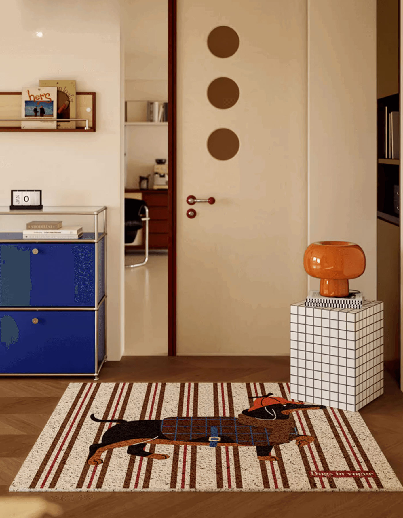 Welcome guests with retro charm and playful energy! Our Paw-sitive Woof Door Mat features Afghan Hounds and Dachshunds dressed in preppy outfits set against vibrant stripes, bringing a delightful touch of character to your entrance.